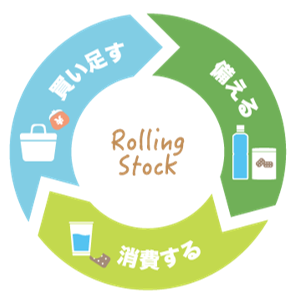 「ローリングストック法」は、災害備蓄品を購入し、賞味期限が来る前に定期的に消費して、不足した分を都度補充するという方法です。定期的な点検につながり、常に新しい備蓄品を備えておくことができます。